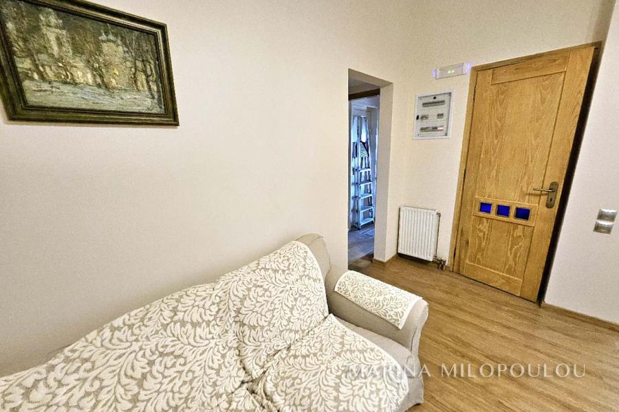 -1ος όροφος, επιφανείας 110 τμ, με ανισόπεδη διάταξη, ο κυρίως χώρος υποδοχής με τζάκι, τραπεζαρία, wc και σε ανισόπεδη διάταξη η κουζίνα με όλες τις ηλεκτρικές συσκευές και δικό της καθιστικό.