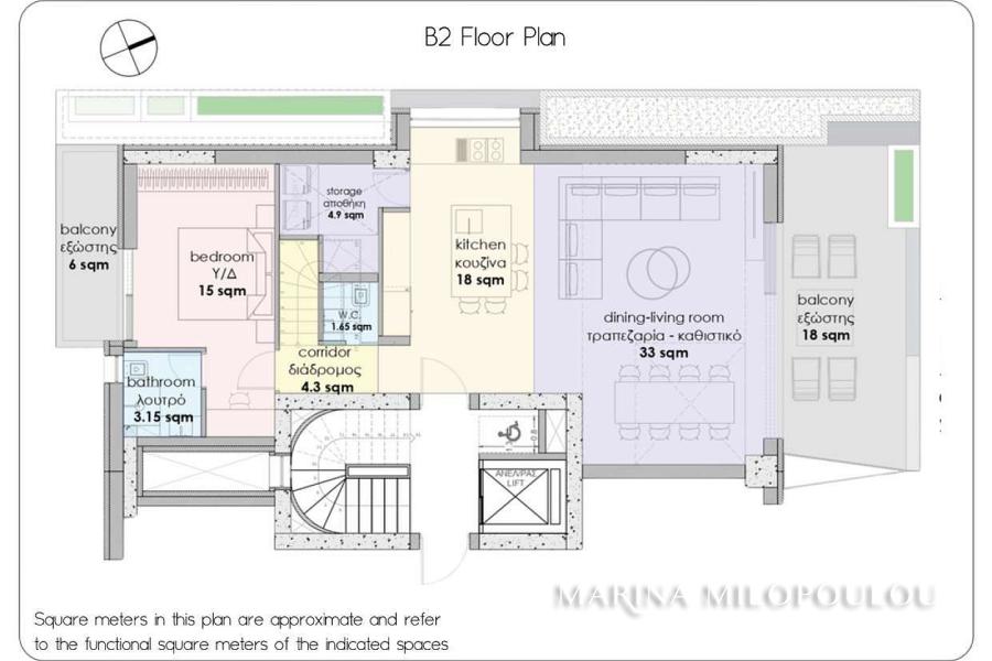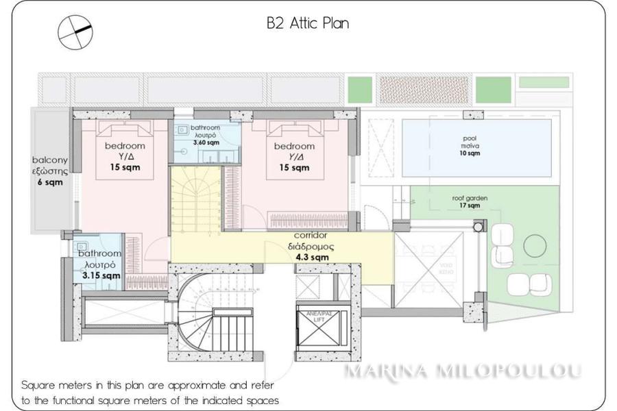 - 4ος όροφος, 71 τμ, loft, με είσοδο και από το κλιμακοστάσιο, 2 master υ/δ, 1 βεράντα και roof garden με την πισίνα (10 τμ).