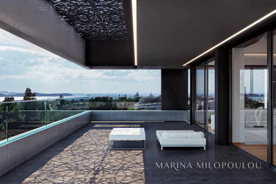 - Στον 3ο όροφο, τύπου loft, επιφανείας 69 τμ, καθιστικό, 1 master υ/δ, μικρή βοηθητική κουζίνα, η οποία εξυπηρετεί την πισίνα. Το sundeck / roof garden επιφανείας 51 τμ έχει απεριόριστη θέα θάλασσας.