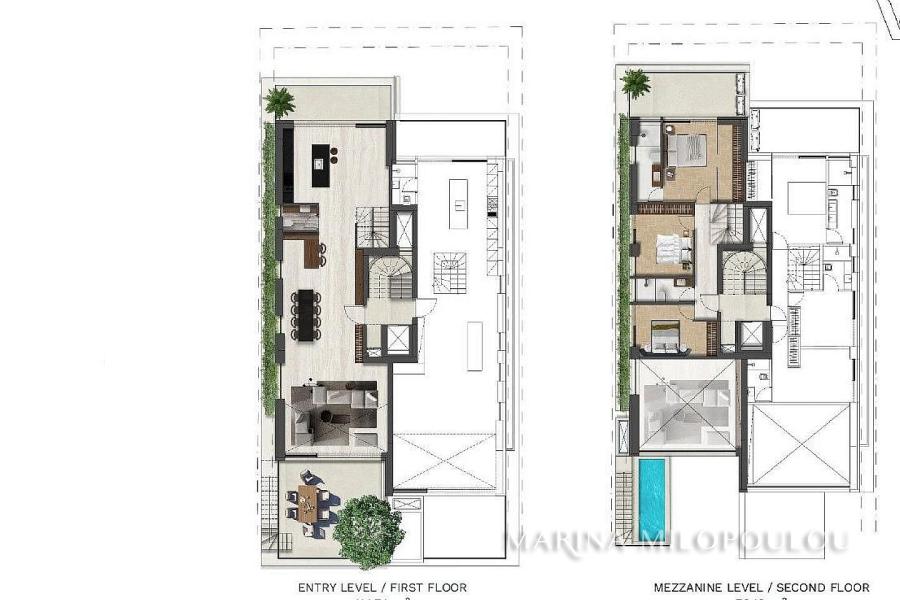 - 2ος όροφος (loft), 79 τμ, 3 υ/δ (το ένα master με έξοδο σε βεράντα) και ο εξώστης με την πισίνα, 10 τμ, στην πρόσοψη του κτιρίου.