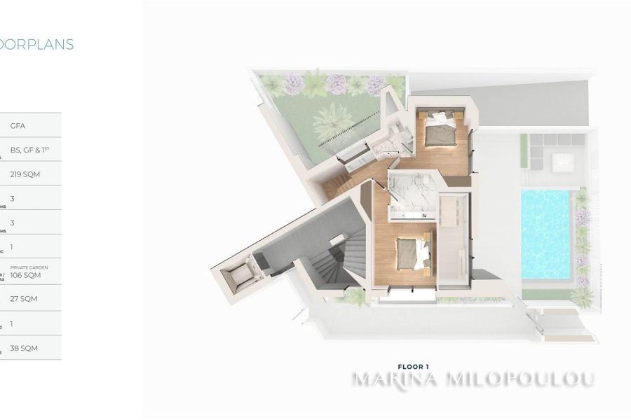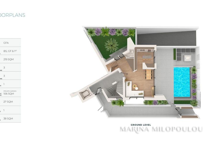 - Ισόγειο, 78 τμ, ο χώρος υποδοχής, τραπεζαρία, ημίκλειστη κουζίνα και 1 wc. 'Αμεση πρόσβαση στον ιδιωτικό κήπο 106 τμ και τον εξώστη (deck) με την πισίνα 27 τμ.