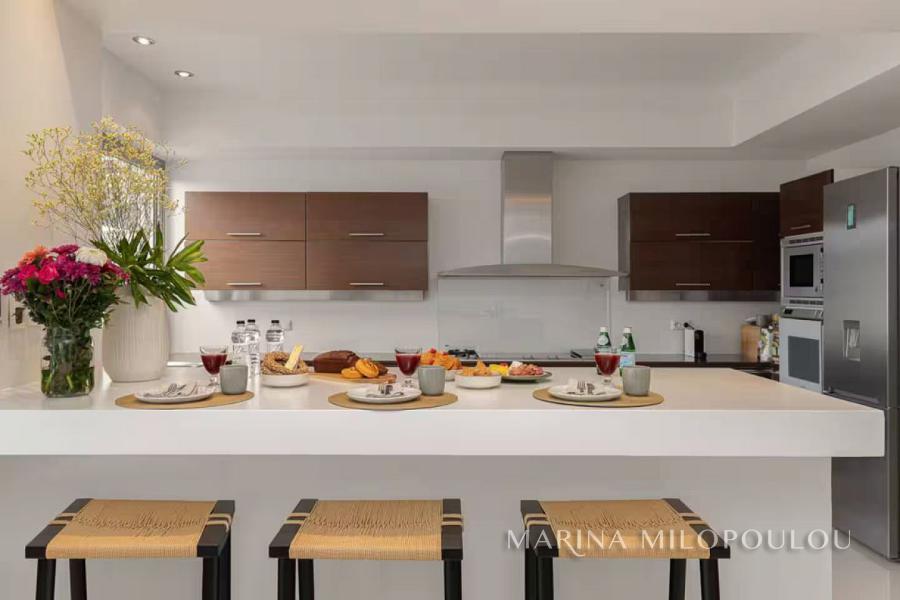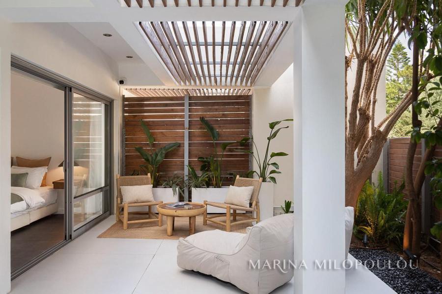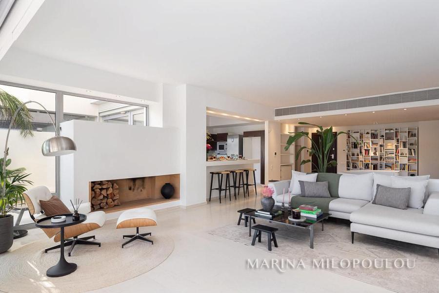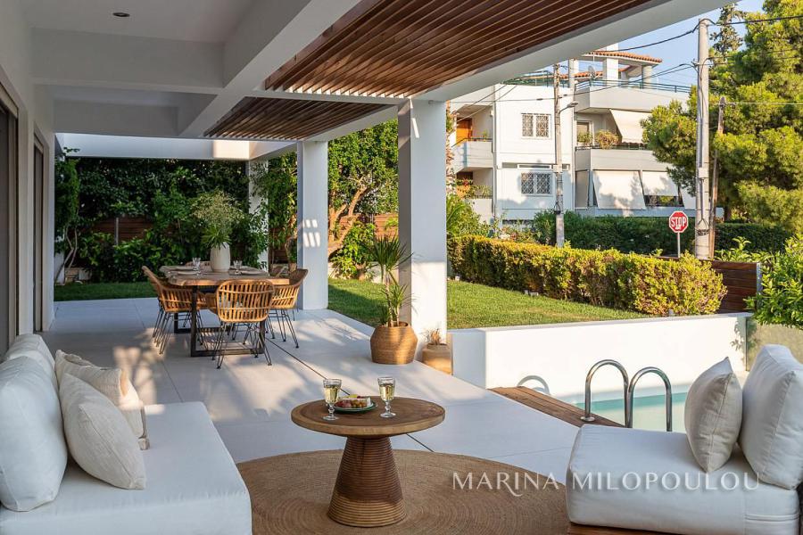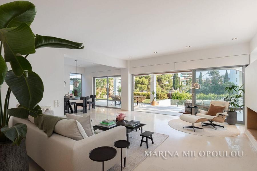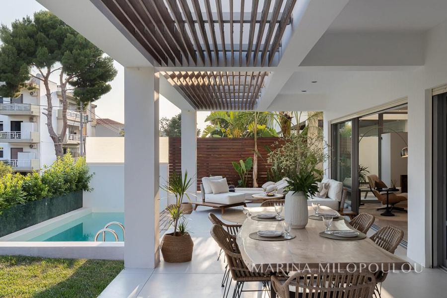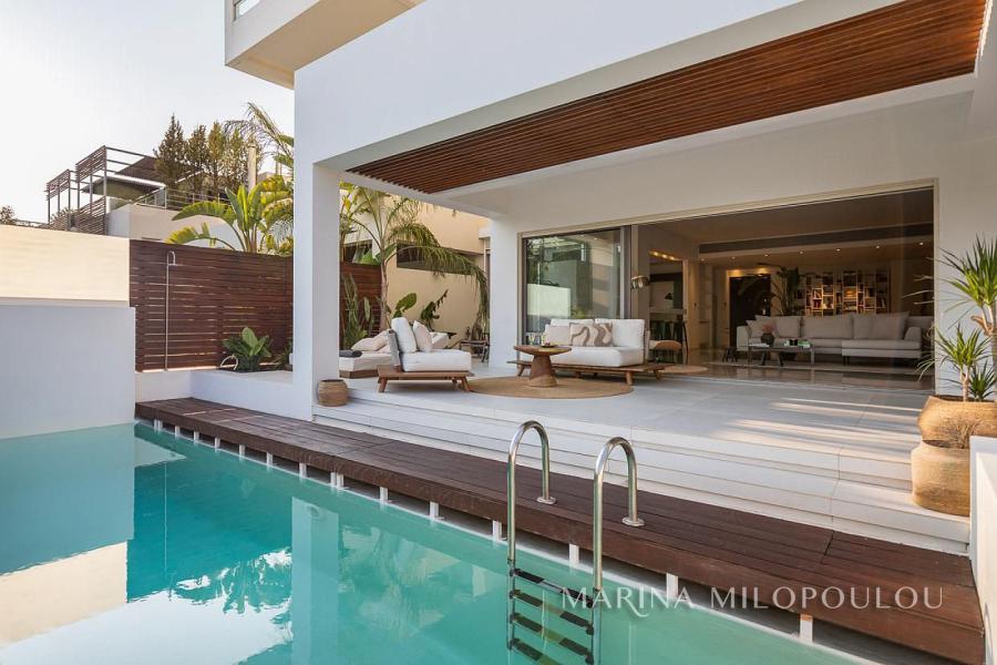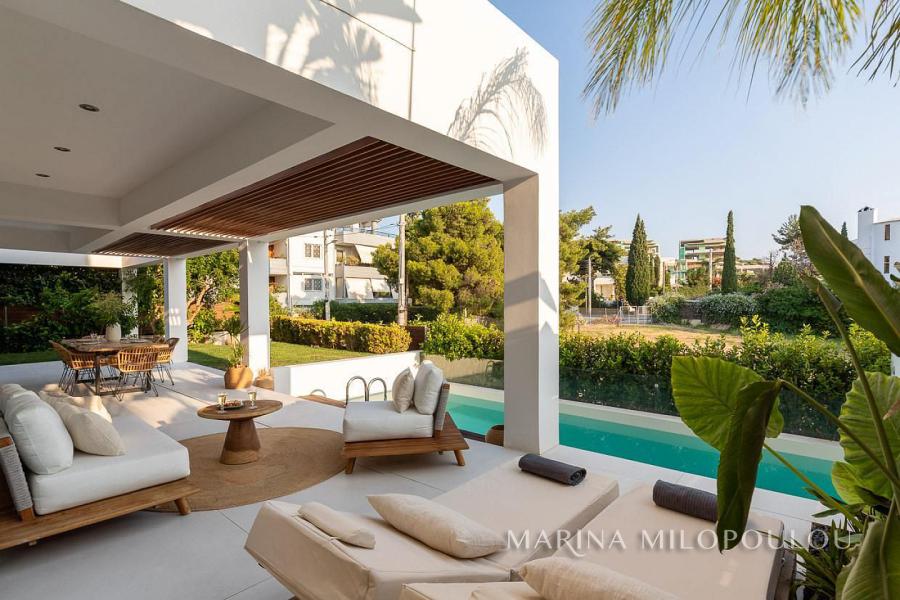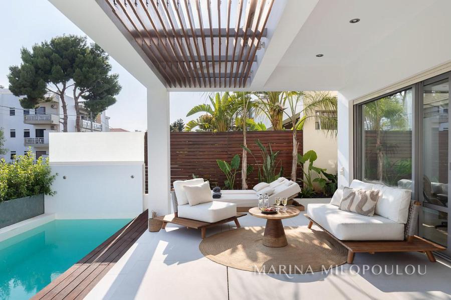 ΒΟΥΛΑ - Πηγαδάκια, σε γωνιακό κτίσμα μοντέρνας αισθητικής, επιπλωμένη μεζονέτα Ισογείου - Υπογείου, συνολικής επιφάνειας 250 τμ, με κήπο και πισίνα.