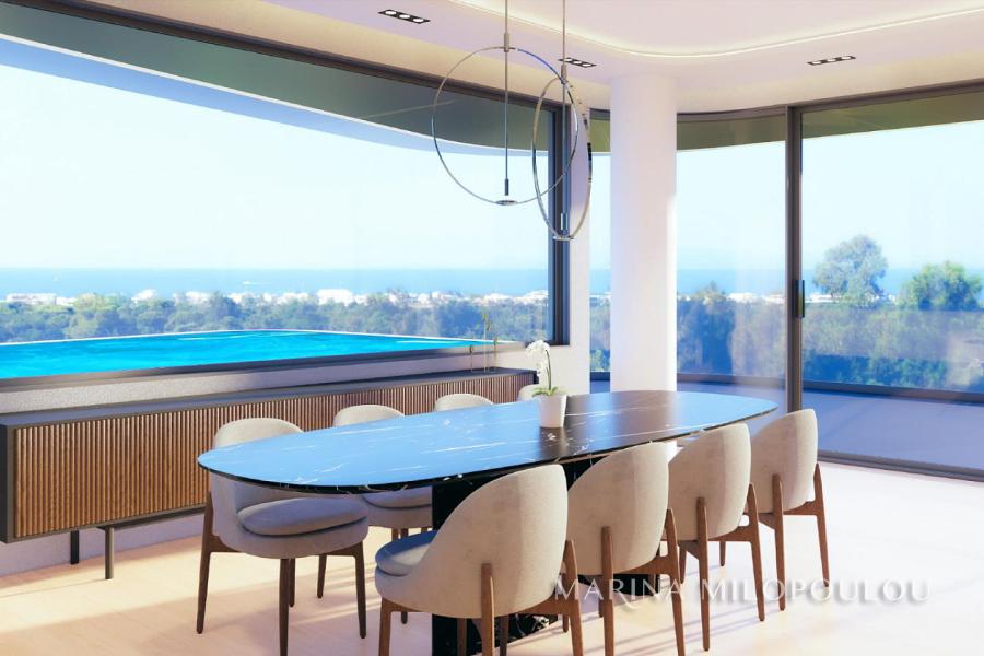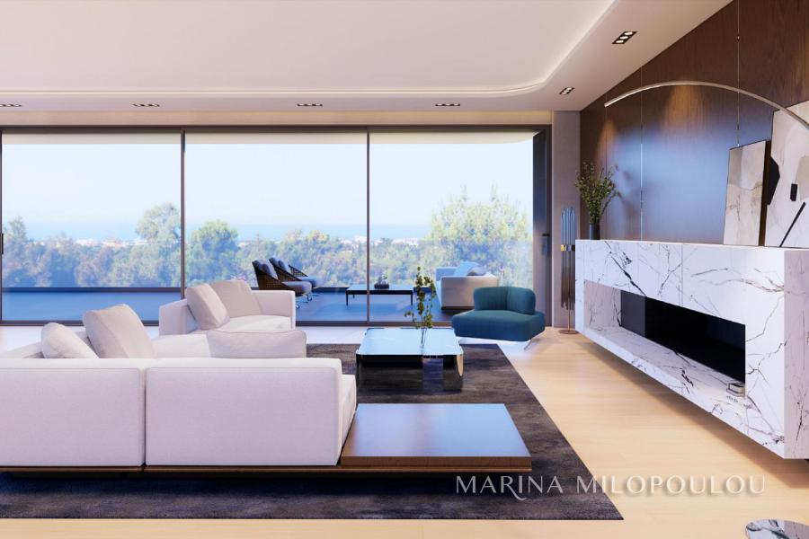 Large reception area with fireplace, dining area, open kitchen, 3 master bedrooms, 1 wc, large front terrace with 13 sqm pool and excellent views of the sea, the Golf course and the Ellinikon Metropolitan Park.