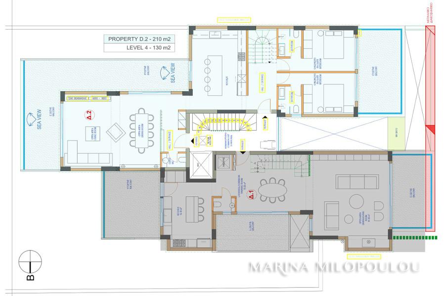 - 4th floor, 130 sq m, reception - dining area, open plan kitchen, 3 bedrooms (the 2 master with a veranda on the facade), 1 additional bathroom, large corner veranda for the living room and the 3rd bedroom with sea view.