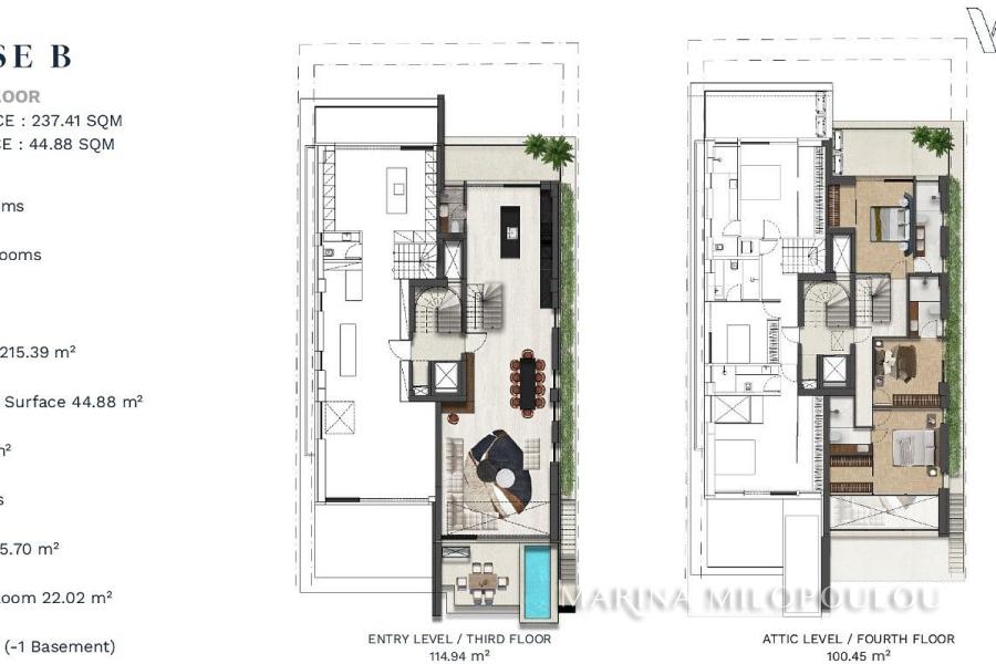 - 3rd floor, 115 sqm, reception area (double height) - dining area, high-standard Italian kitchen, verandas on 2 sides of the apartment, on the frontage veranda the pool of 12,5 sqm.